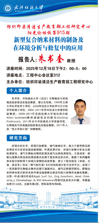 2025年12月18日下午,工程中心在6号楼310会议室举办第536期阳光论坛。本次论坛邀请了中国地质大学(武汉)朱书奎教授作了题为新型复合纳米材料的制备及在环境分析与修复中的应用的报告。论坛由教育部工程中心主任夏东升教授主持,工程中心教师及研究生参与了此次论坛。